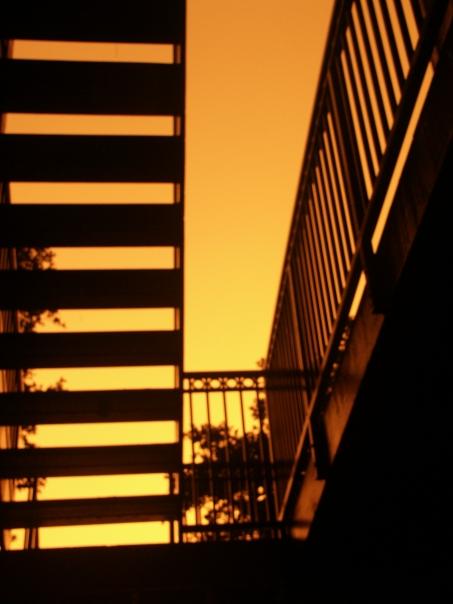 The photo shows wooden stairs and railings the sky is a golden yellow color.