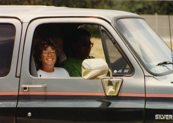 A brown haired lady with curls and large glasses smiling from the passenger seat of an SUV.