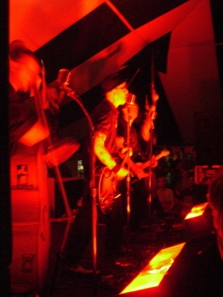 Musicians play at a club in red and orange light, there is a bass player and a guitar player.