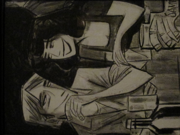 The picture is a drawing of a man and a woman sitting together at a bar.