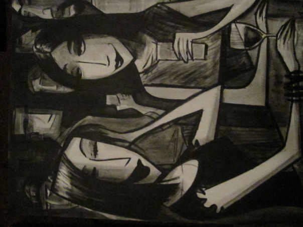 This is a picture drawn with blach paint.Two ladies sitting one to aother holding drinks in the glass