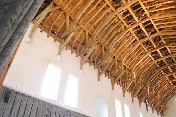 Large wooden support beams are exposed under an arched room in a high building with high windows.