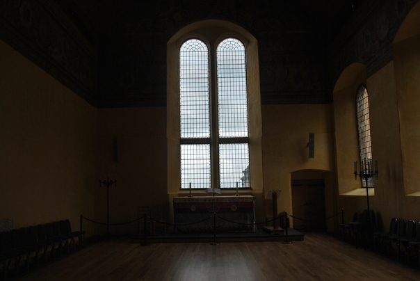 Very tall windows are behind an altar of a chapel that has no pews- only chairs along the side wall.