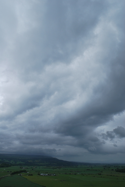 A foggy sky above a green, open landscape.