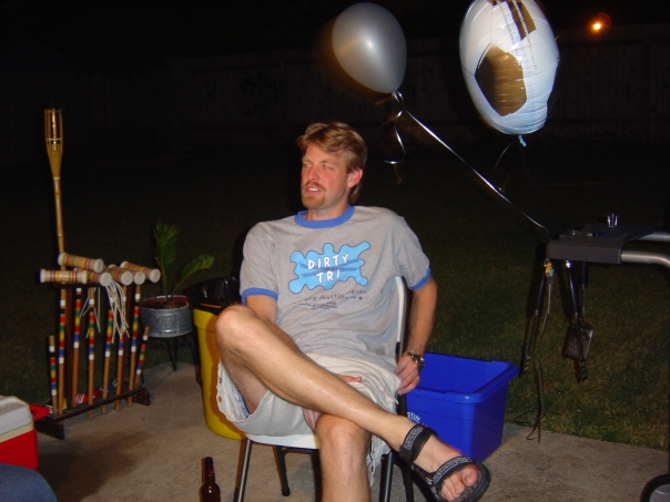 A man in a t-shirt and shorts sits on a chair on a cement patio at a party.