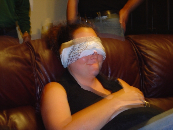 lady blind-folded, couch, photo is blurry