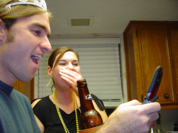 A guy is holding a beer bottle and cell phone with a girl looking on