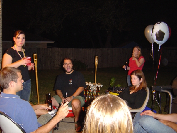 night backyard party, balloons, beer, croquet, friends, college, young adults