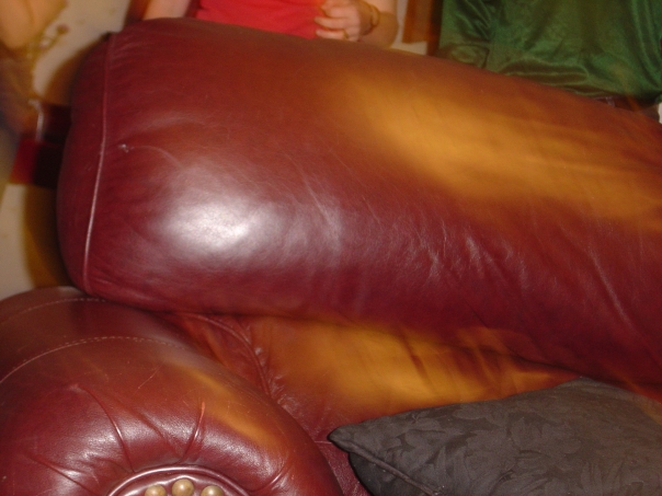 A red and slightly yellowed cushion of a couch. The part where you lie on looks like a hot dog frank.