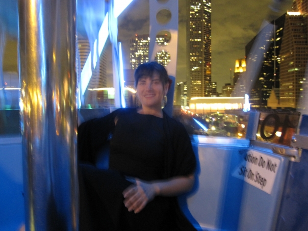 This blurry photo is of a woman in a nice dress taking a nighttime ferris wheel ride.