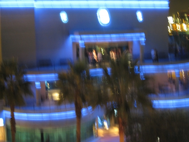 This is an image of a hotel with neon edging, surrounded by palm trees at night.