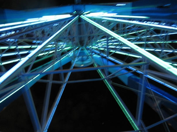 Look upward, this bluish green blurry structure seems to be a Ferris wheel rotating at night.