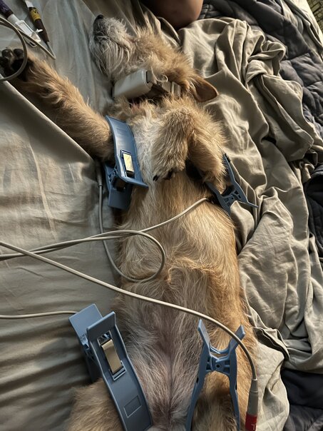 So we did some research and figured out specifically which leads are used for dogs and where they're specifically attached. While we got some basic readings from the machine, we couldn't get a consistent heart rhythm on Atti and figured that it had to do with her thick fur.