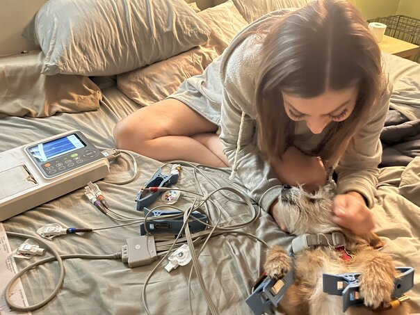 So we did some research and figured out specifically which leads are used for dogs and where they're specifically attached. While we got some basic readings from the machine, we couldn't get a consistent heart rhythm on Atti and figured that it had to do with her thick fur.