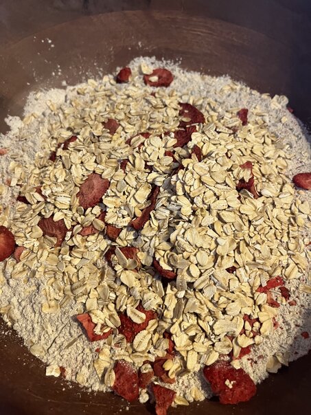 This was a concoction that I had the idea for. While it's difficult to put fresh berries inside of sourdough (given the additional water content and the 500 degree oven involved), it occurred to me that I could probably get freeze-dried fruits and berries, mix them into the dough, and then the steam and heat would rehydrate them to make them seem fresh.