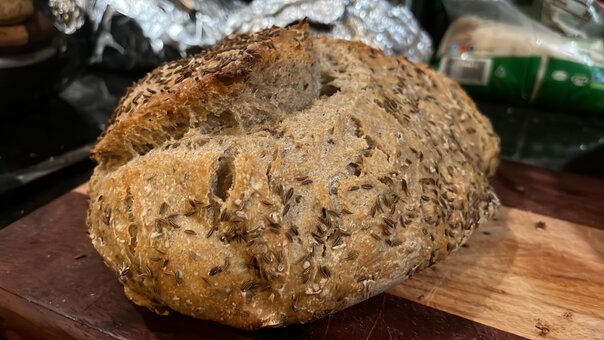 This was a concoction that I had the idea for. While it's difficult to put fresh berries inside of sourdough (given the additional water content and the 500 degree oven involved), it occurred to me that I could probably get freeze-dried fruits and berries, mix them into the dough, and then the steam and heat would rehydrate them to make them seem fresh.