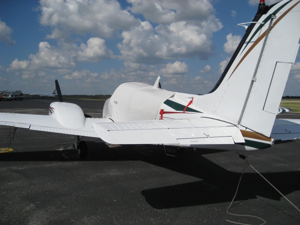 A tarp covers the front of a small white plane that is parked on a black tarmac.