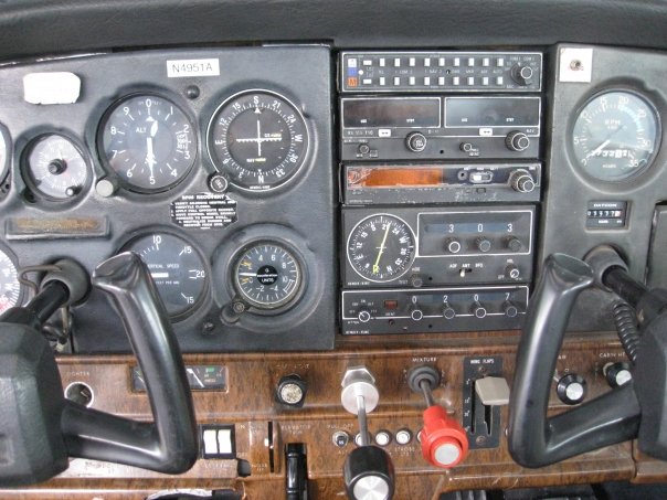 There is a dash board with electronics on it looks old