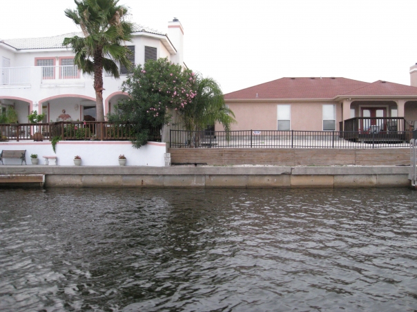 A view from the water toward 2 contrasting patios of neighboring stucco homes - one is practically empty while the other is filled with decorative objects and foliage.