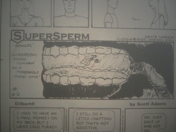 Black and white cartoon titled "SuperSperm" shows character exploring moist cave.