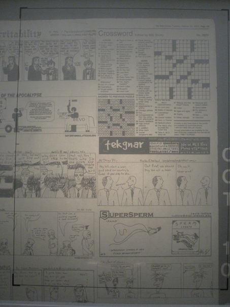a newspaper with crossword and cartoon and entertainment section and a large rectangle marked on top of it