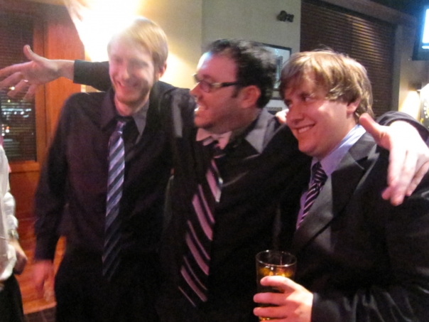 Aftermath of three of the groomsmen of a very happy wedding.