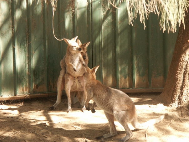 the kangaroos seem to be having a fun time playing in the yard
