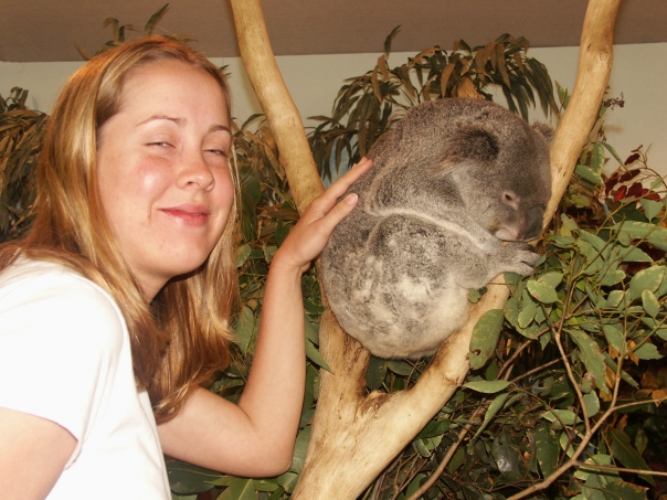 A blonde woman in a white t-shirt pets a koala bear that has curled up in a tree.