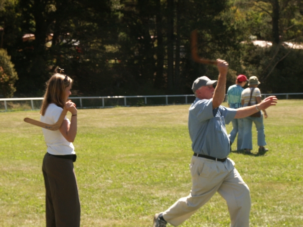 A girl in brown pants and a man in a blue shirt throwing boomerangs.