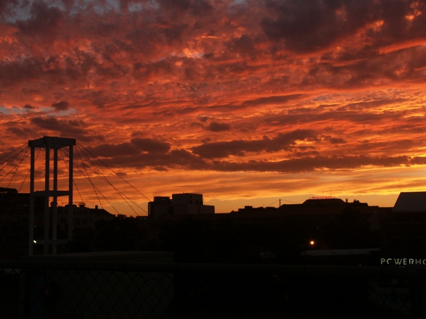 A sunset, the sky is orange clouds, there are urban buildings and a bridge silhouetted.
