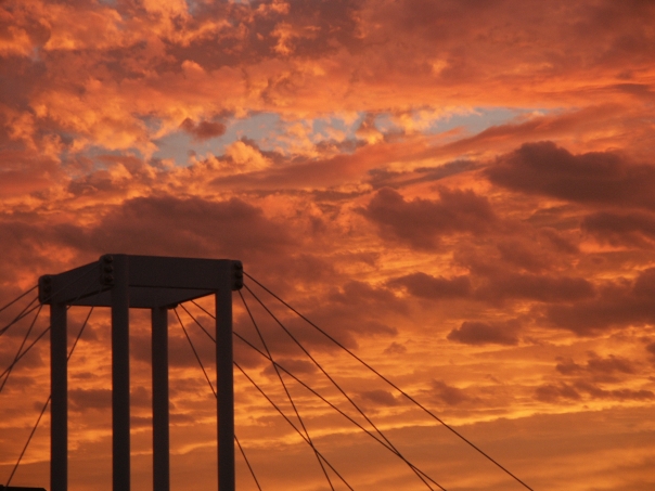 Beautiful red sky during a sunset from the view of a bridge with red clouds overtaking the blue sky.