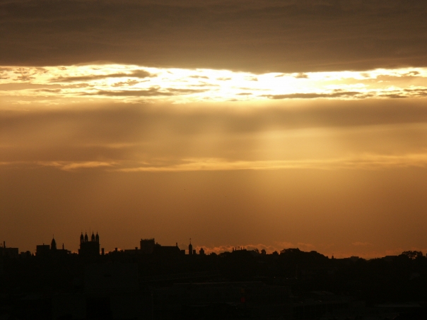 Gold sky over a sleeping town in Jeruselum, the rays of an early dawn break through the clouds onto the quite community.
