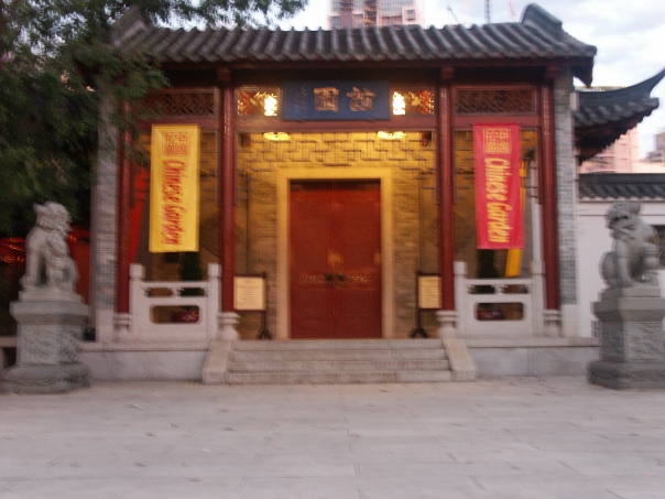 Out of focus building with Chinese theme facade, complete with two lions guarding the steps of the building with red doors.
