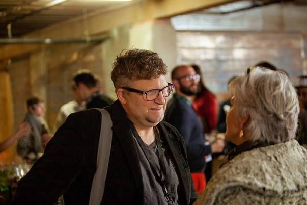 A man with curly brown hair and black glasses is wearing a black jacket and talking with a woman.