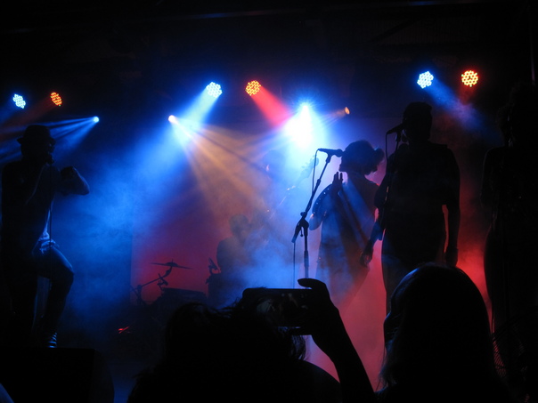 Singers are performing on a dark stage with blue and red lights glowing through a dense fog.