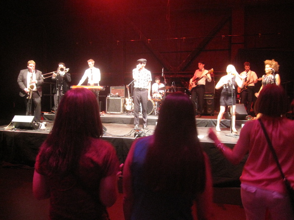 A seven piece band plays along with two female back-up singers, while three women listen and dance to the riveting beat.