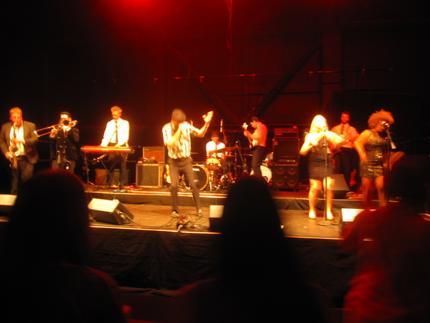 A large stage with several musicians and singers performing.