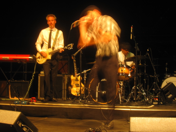 The singer appears to be having the time of his life while the guitarist and drummer are playing with a lot less enthusiasm.
