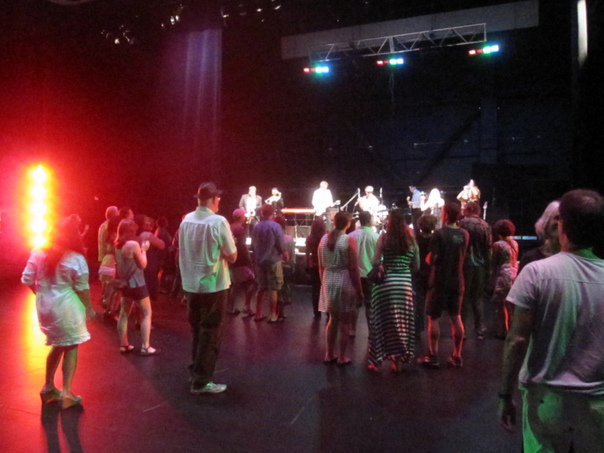 A large crowd of people standing in front of a stage.