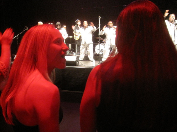 Two girls in a crowd basked in red light looking at the stage.