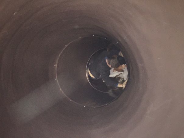 A couple of people sliding down very dark but comfortably wide tunnel slide.