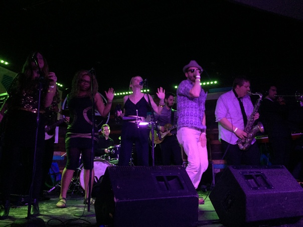 A lead singer wearing a ska hat belts out a song, accompanied by saxophone, drums, guitar, and backup singers.