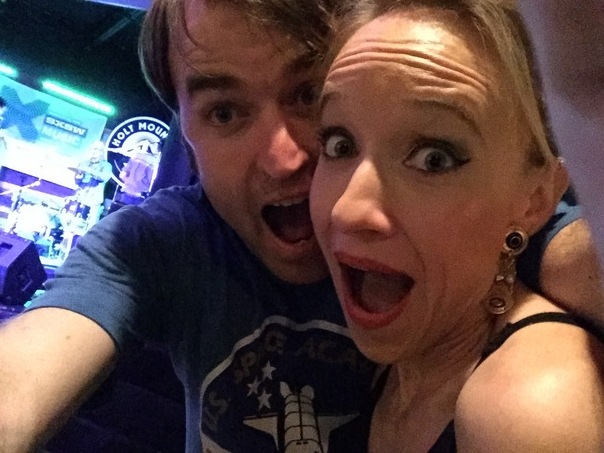 A man and a woman are taking a picture together making silly faces with their mouths wide open.