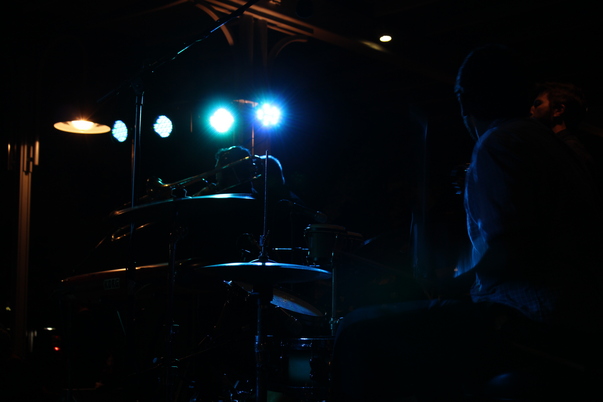 Dark shot of a band playing with bright spotlights and the drums in view.