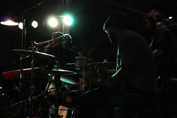 The band is performing in a dark venue and the drummer has big drums.