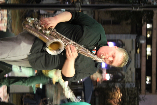 This blurry photo is turned to the side, and it shows a larger man dressed in black and grey and playing a silver saxophone.