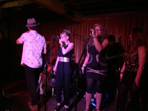 Women in black outfits are singing on stage in front of dark instruments. There is a man in a white shirt with his back turned towards the camera.
