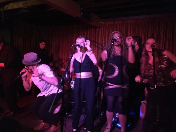 A group of 5 or more men and women are performing on a stage. They are singing and dancing.