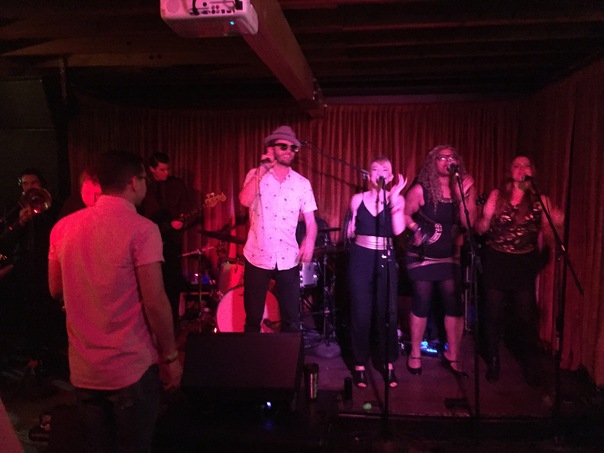 A musical band performs on a stage under lights as its four singers--three women and a lead male singer wearing a hat and sunglasses--sing together.