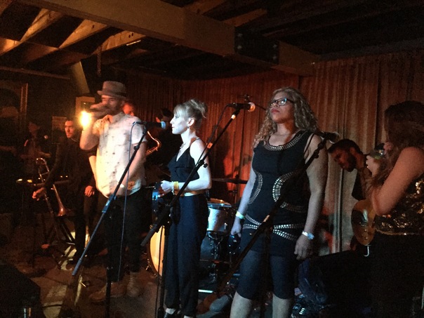 Group of people performing on stage with the man holding the mic to his face and the women just waiting staring out to the crowd.